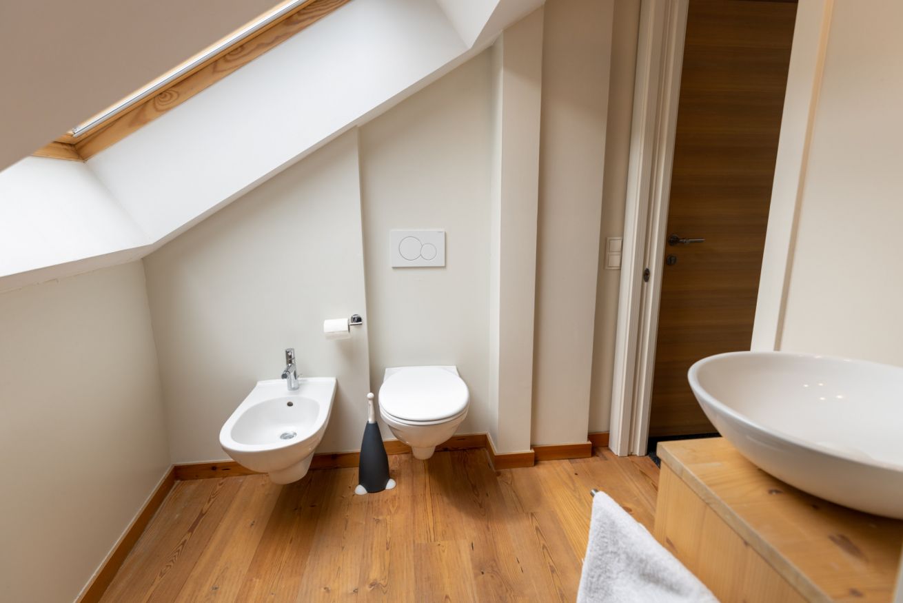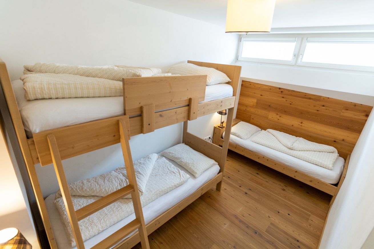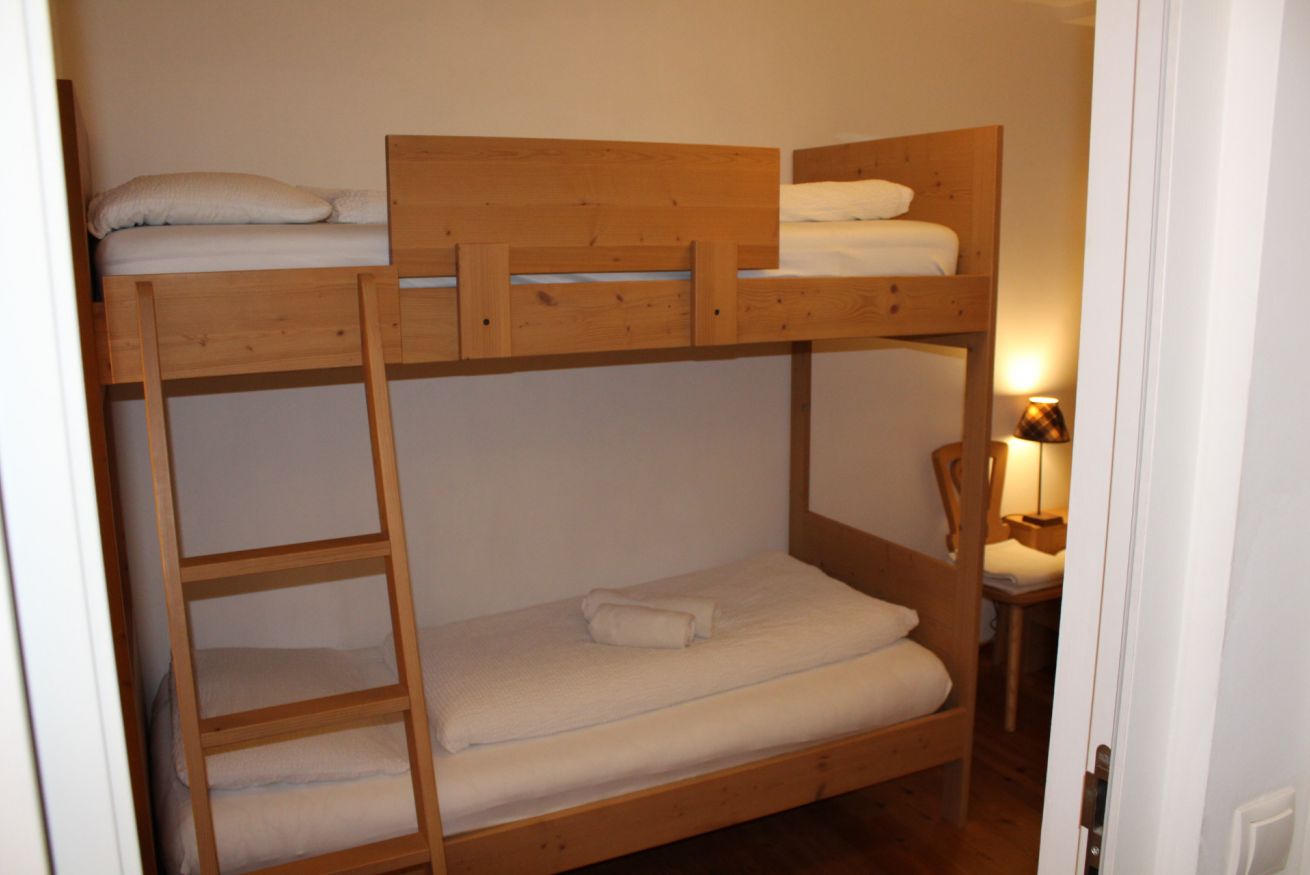 Apartment with two bedrooms: one with a double bed and the other with a bunk bed and a single bed. Living room with sofa bed, fully equipped kitchen, two bathrooms (one with a shower and the other with a washer and dryer). Central location, perfect for families or groups seeking comfort and convenience