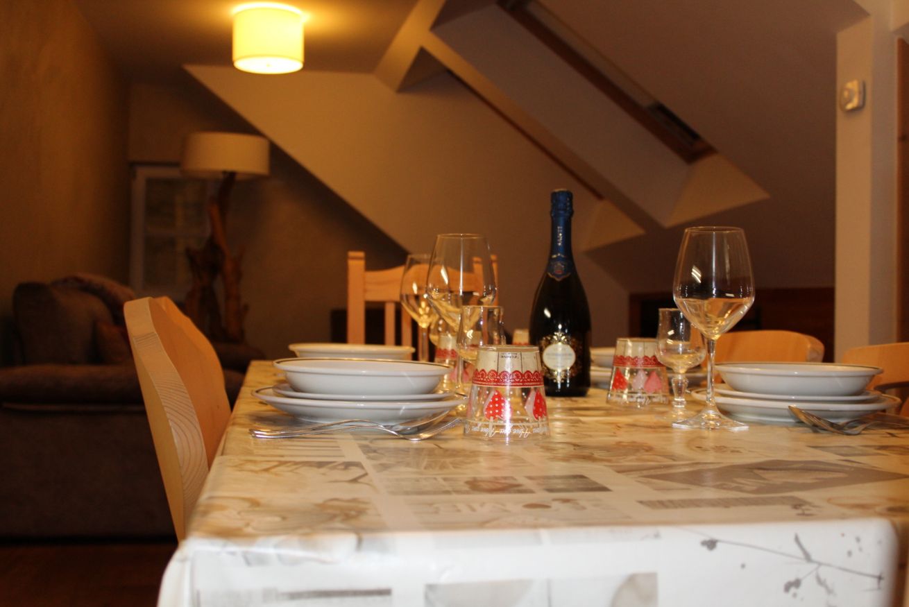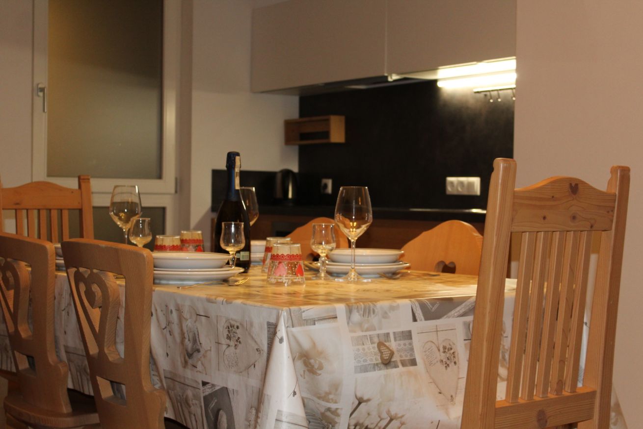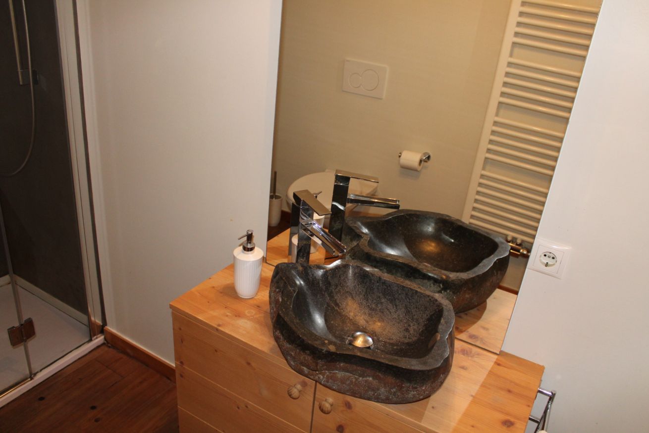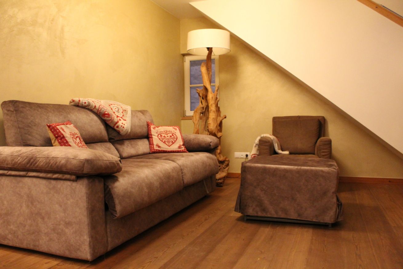 Apartment with two bedrooms: one with a double bed and the other with a bunk bed and a single bed. Living room with sofa bed, fully equipped kitchen, two bathrooms (one with a shower and the other with a washer and dryer). Central location, perfect for families or groups seeking comfort and convenience